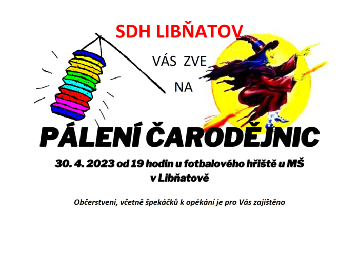 Sbor dobrovolných hasičů v Libňatově Vás zve na tradiční Pálení čarodějnic, které proběhne v neděli 30. dubna od 19 hodin u fotbalového hřiště u MŠ v Libňatově.