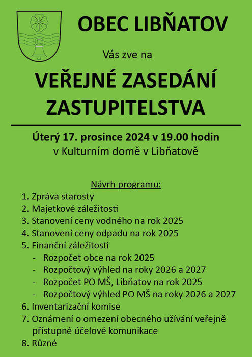 Pozvánka na veřejné zasedání zastupitelstva obce 17.12.2024