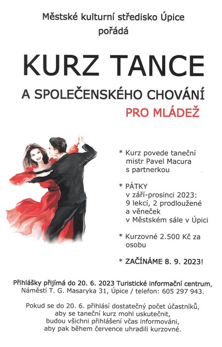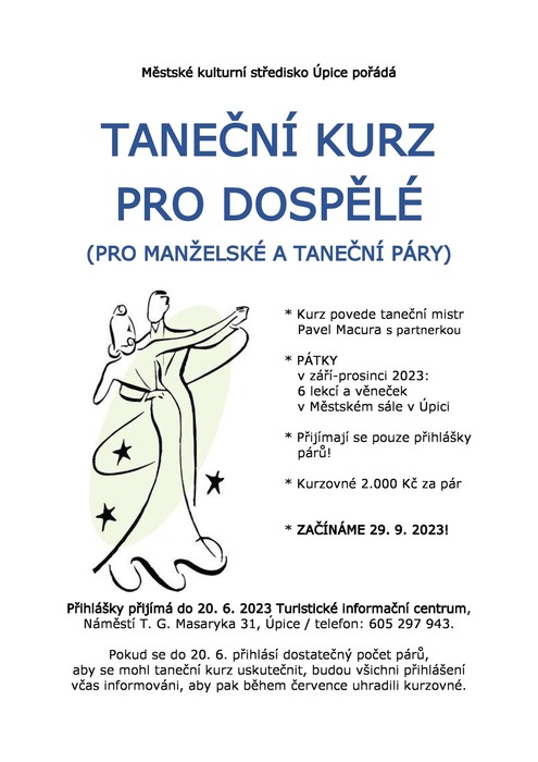 Městské kulturní středisko Úpice bude od letošního podzimu opět pořádat taneční kurzy. Věnujte pozornost přiloženým plakátům, pokud máte o kurzy zájem.