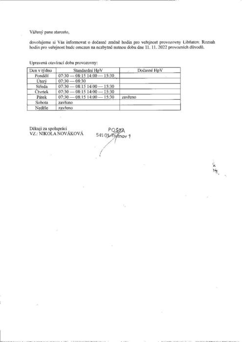 Česká pošta oznamuje, že její pobočka v Libňatově bude dne 11.11.2022 uzavřená.