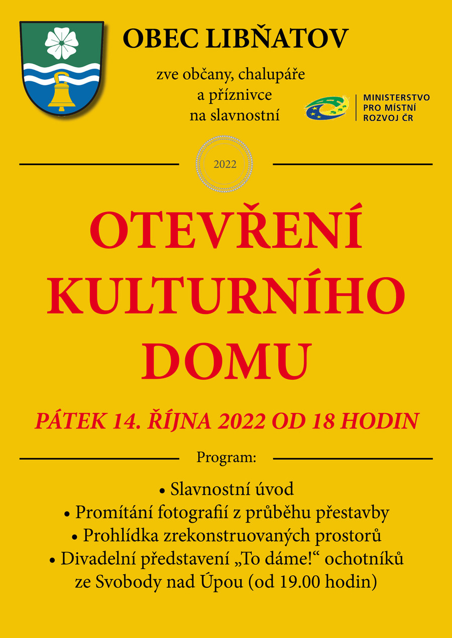 Naplánujte si návštěvu moderně zrekonstruovaných prostorů kulturního domu v Libňatově, na jehož přestavbu významným dílem přispělo Ministerstvo pro místní rozvoj České republiky.